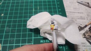 ガンプラに限らず、塗分けは重要!色と色の境目が雑になってしまうと全体的に雑に見えてしまうので通常のマスキングテープとマスキングゾルを使い分けてしっかり色分けします。